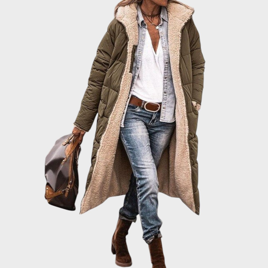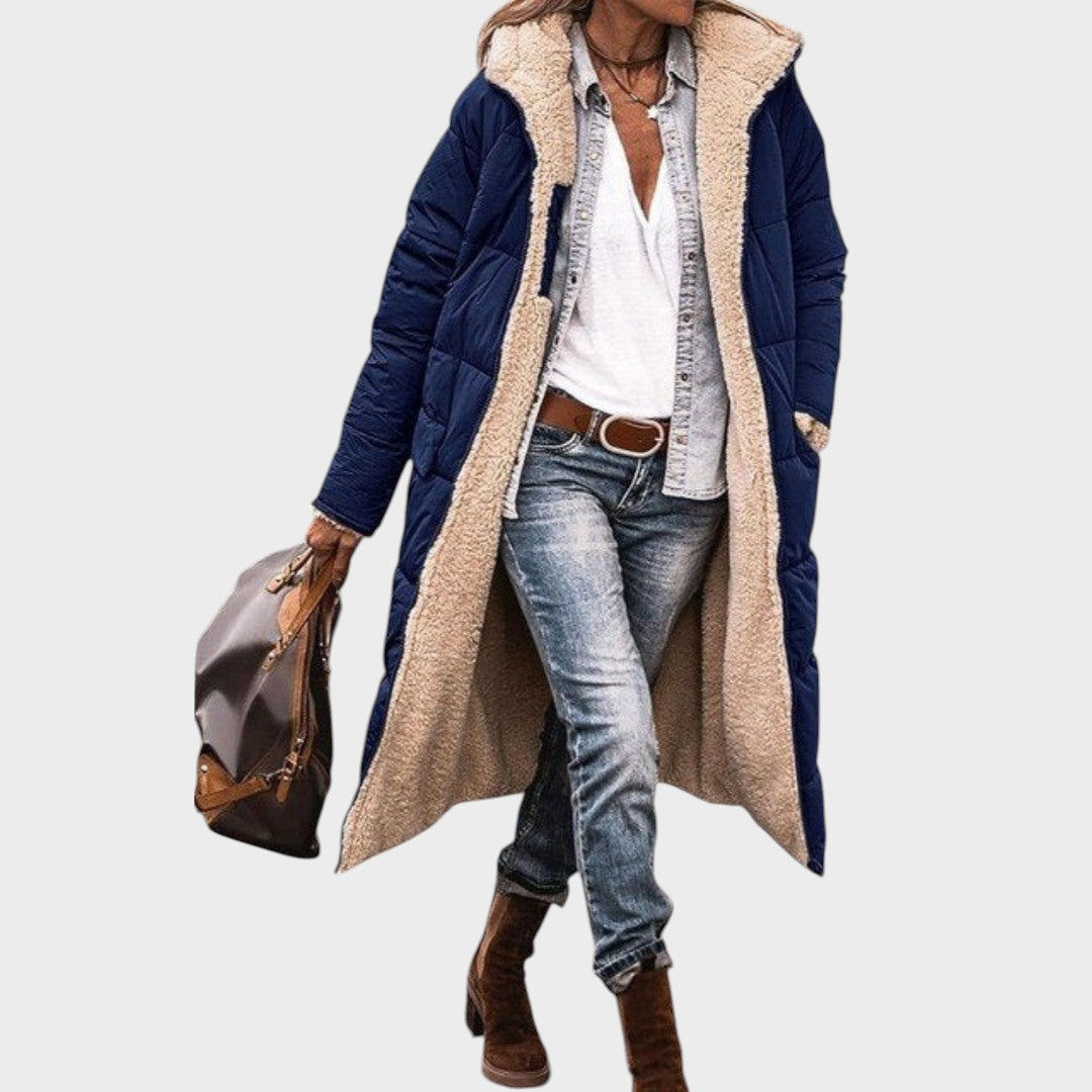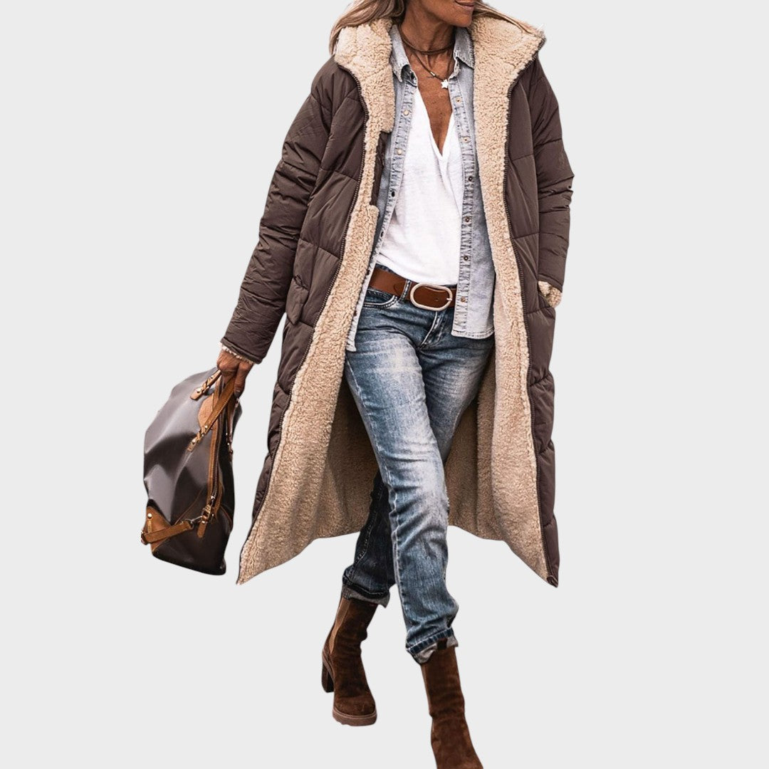Discover the perfect combination of comfort and style with the reversible Camellia jacket. This long coat is your ideal companion for the coldest days and nights: warm, comfortable, and irresistibly elegant. It offers double elegance thanks to its reversible design, along with unparalleled warmth and softness.