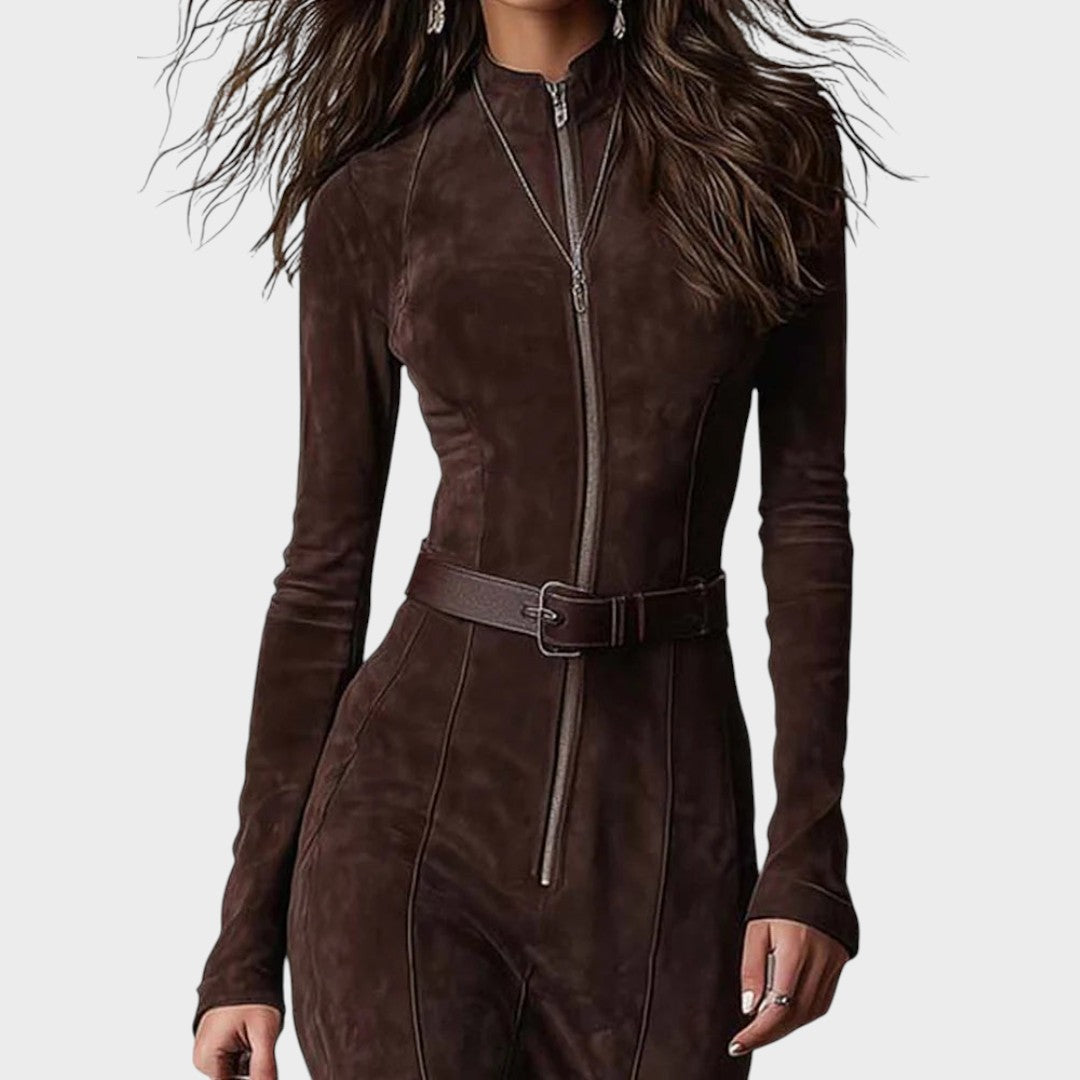- Front zip and belt: Adjustable fit that enhances your figure.