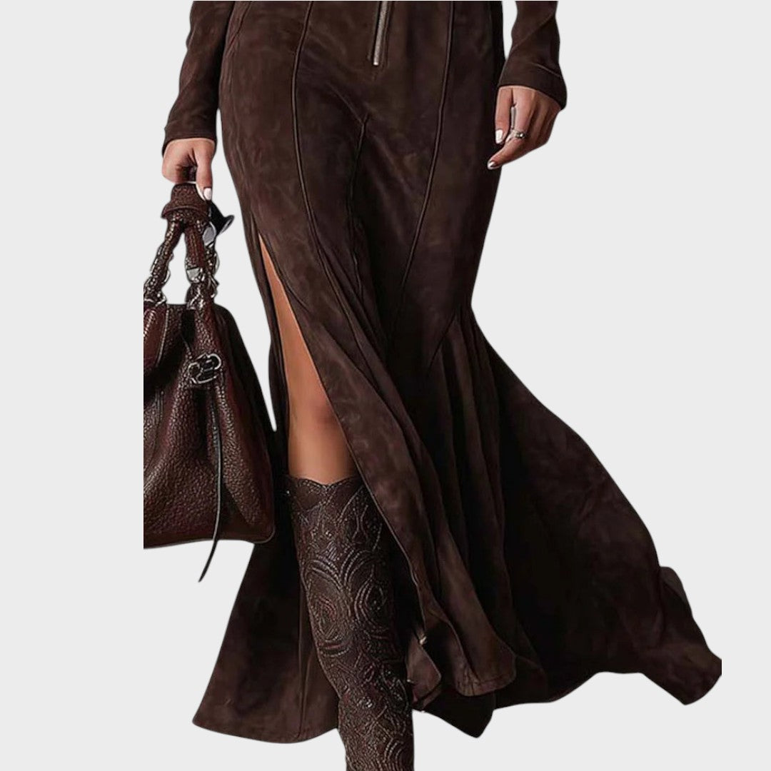Add a touch of distinction to your wardrobe with this stunning long brown dress, featuring an elegant front zip and a high side slit. Made from soft synthetic suede, it combines vintage charm with a modern twist. The fitted bodice enhances your figure, while the high side slit adds movement and sensuality. Perfect for both casual outings and glamorous evenings.